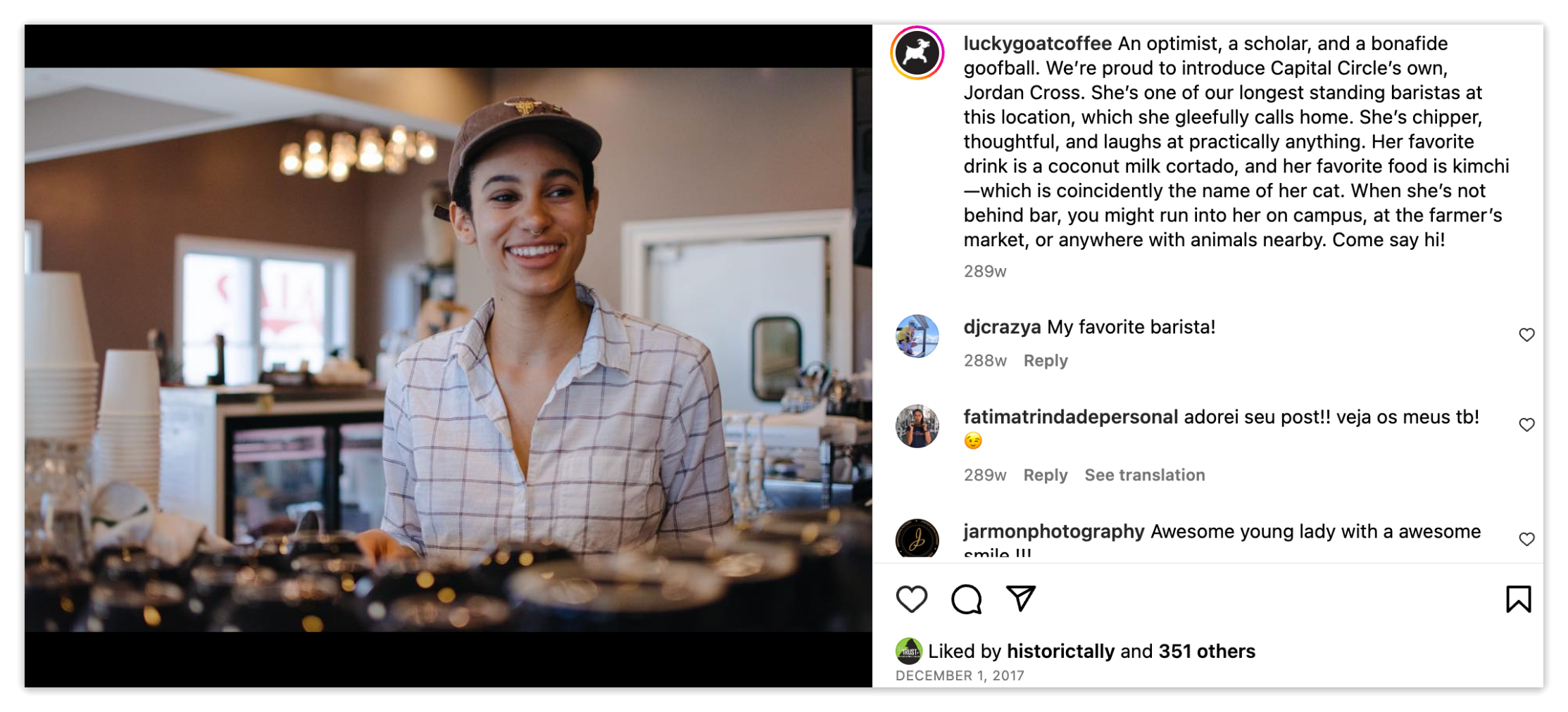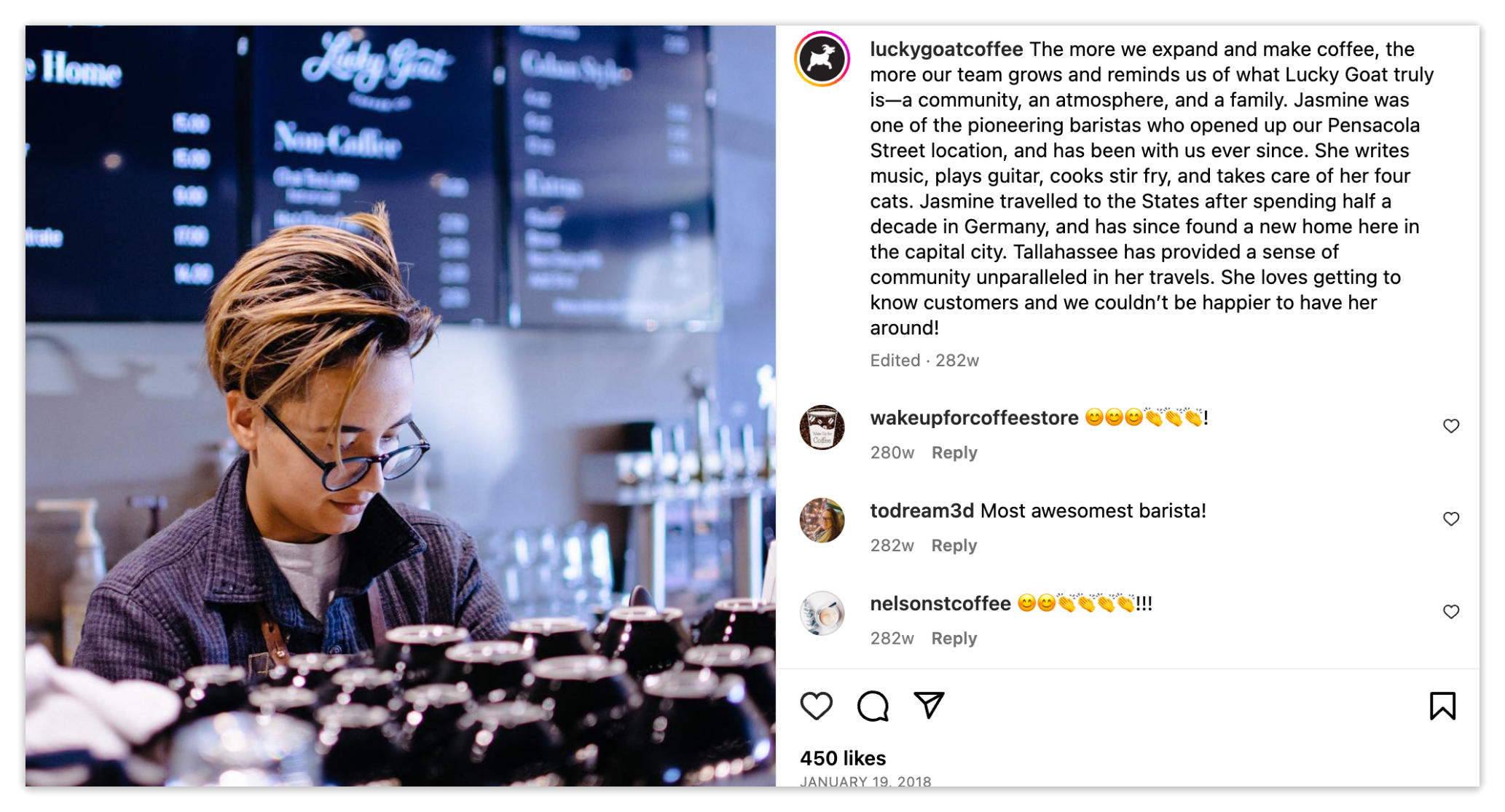 Lucky Goat Coffee Company is a coffee roastery based in Tallahassee, Florida with 7 cafe locations in the Southeast Region. With a dedication to sourcing the finest beans, Lucky Goat boasts a wide variety of coffee selections to be enjoyed in the cafe, at home, or within their many wholesale locations. During her time with the company, Amanda used her barista background and marketing degree to elevate the pre-existing brand work, assisting in a wide variety of projects including catalog design, web design, merchandise design and management, and social media management. From October 2016 to March 2018, the company’s Instagram profile grew by over 9000 followers under her management. Lucky Goat Coffee’s branding vision is an elevated coffee experience, warmed up with Southern charm and a compassionate focus on highlighting the team members who keep the coffee flowing.
